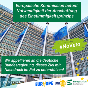 Europa-Union und JEF setzten sich im Rahmen der #NoVeto-Kampagne mit weiteren Partnern seit langem für die Abschaffung des Einstimmigkeitsprinzips im Rat der EU ein. Unsere #NoVeto-Forderung ist auch Bestandteil unserer #EurHope-Kampagne zur Europawahl.