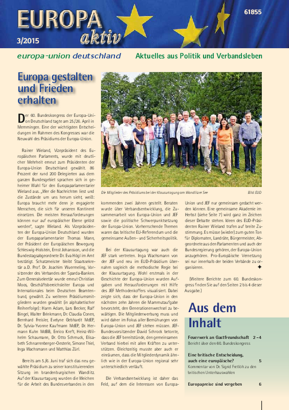 In der Ausgabe 3-2015 erwartet Sie ein ausführlicher Rückblick auf den Bundeskongress der Europa-Union in Memmingen und die Klausurtagung des neugewählten Präsidiums. Des weiteren finden Sie Beiträge zu den Unterhauswahlen in Großbritannien, den Aktivitäten der Europa-Union Parlamentariergruppen und den Preisträgern der Europapreise 2015. Auch aus den Landesverbänden gibt es wieder viel zu berichten.
